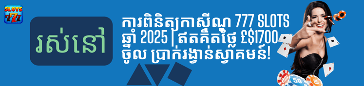 ហ្គេមកាស៊ីណូម៉ាស៊ីន Slots777 គឺជាហ្គេមស្លតតាមអ៊ីនធឺណិតដែលផ្តល់ជូននូវប្រធានបទ វិលជុំ និងមុខងារប្រាក់រង្វាន់ផ្សេងៗ។ ពួកគេចម្លងម៉ាស៊ីនស្លតបុរាណ ប៉ុន្តែជាមួយនឹងការបន្ថែមការកែលម្អឌីជីថលដូចជាការបង្វិលដោយឥតគិតថ្លៃ មេគុណ និង Jackpot រីកចម្រើន។ អ្នកលេងគ្រាន់តែបង្វិលបង្វិល ហើយសង្ឃឹមថានឹងផ្គូផ្គងនិមិត្តសញ្ញាដើម្បីឈ្នះរង្វាន់។